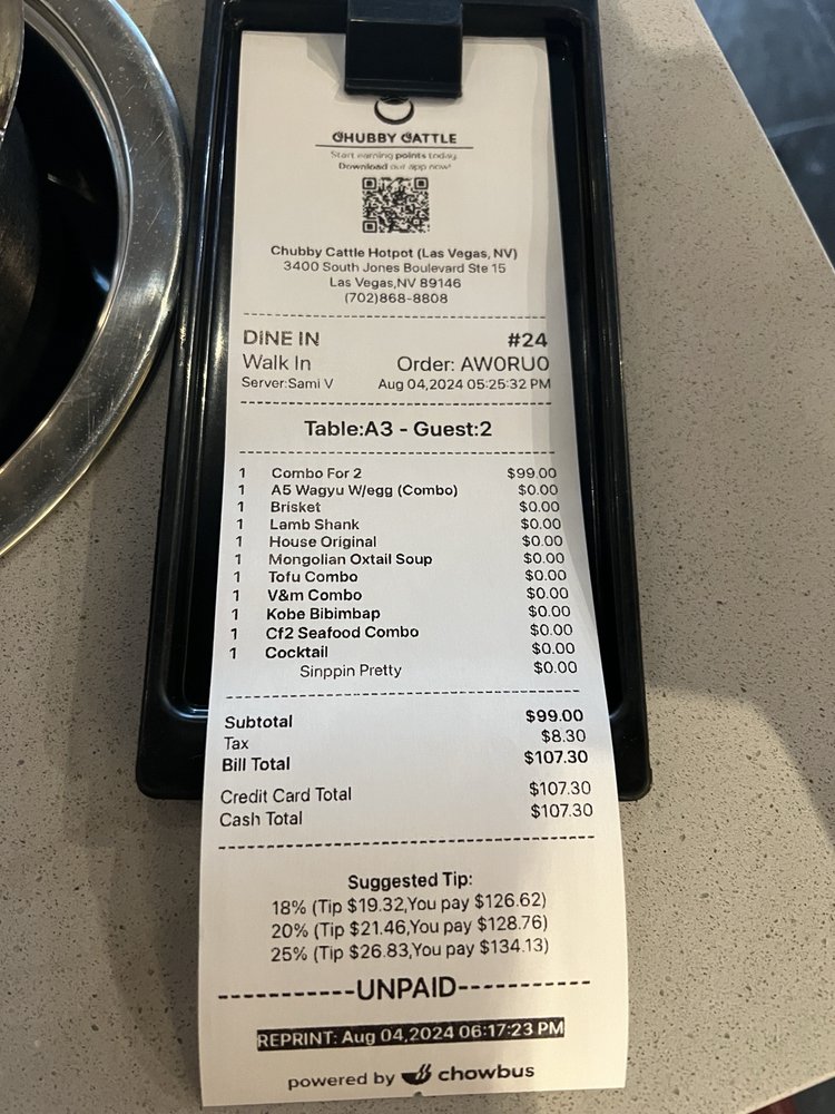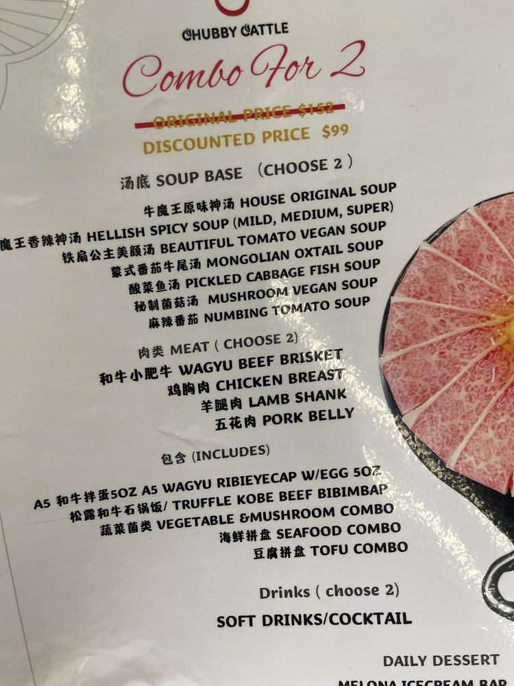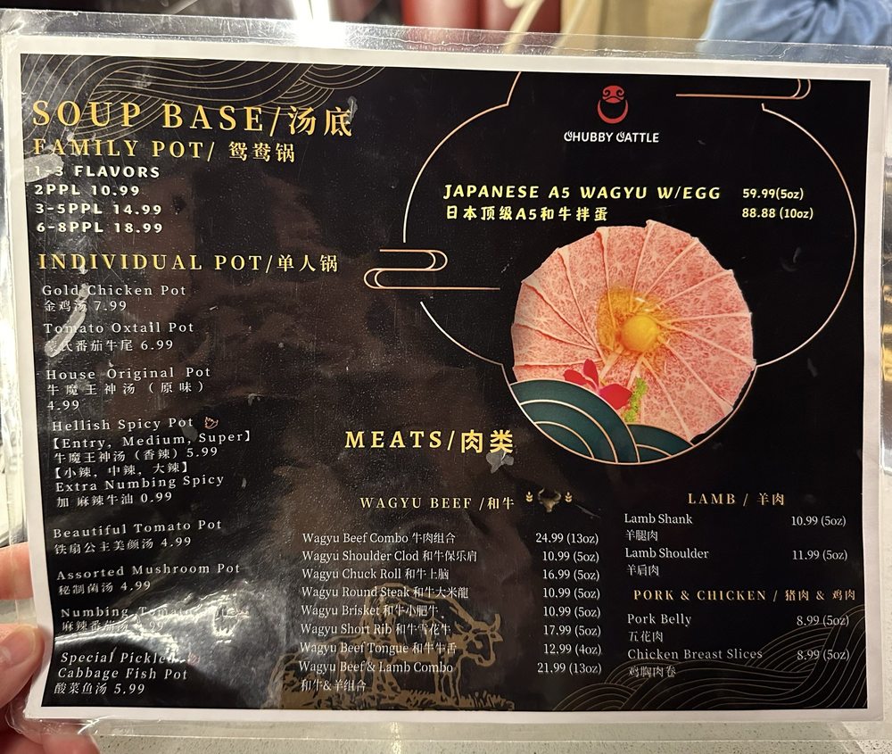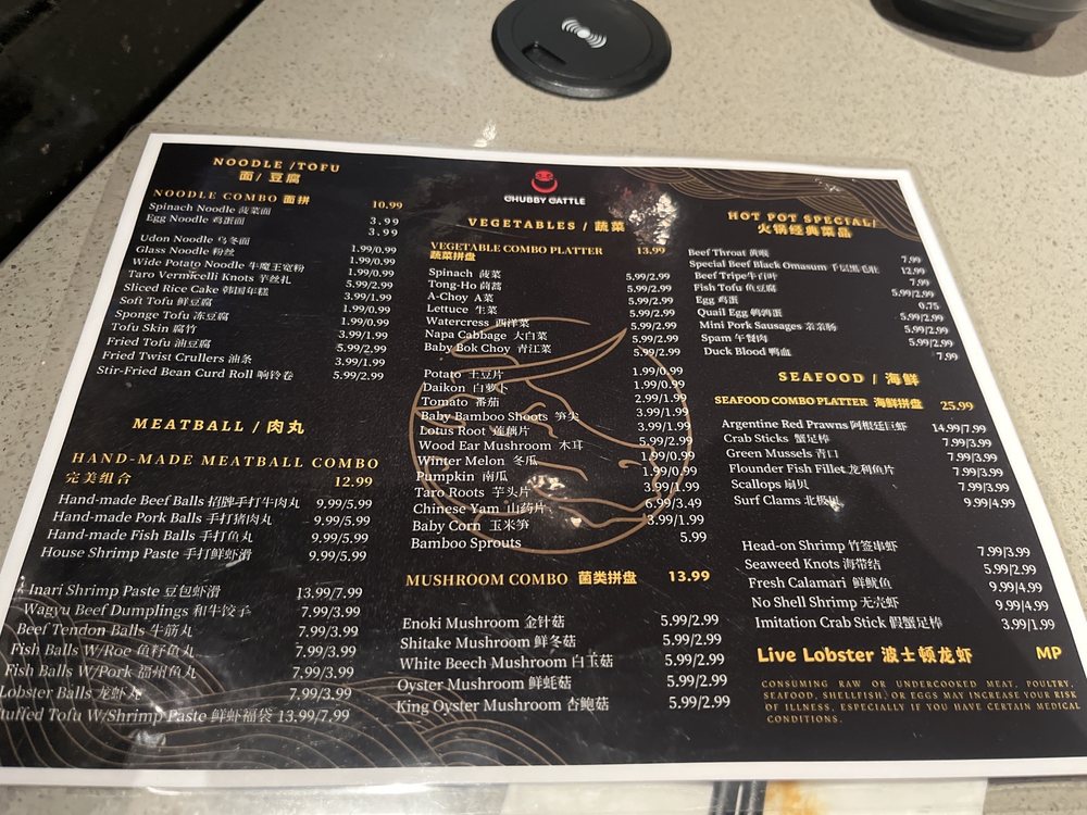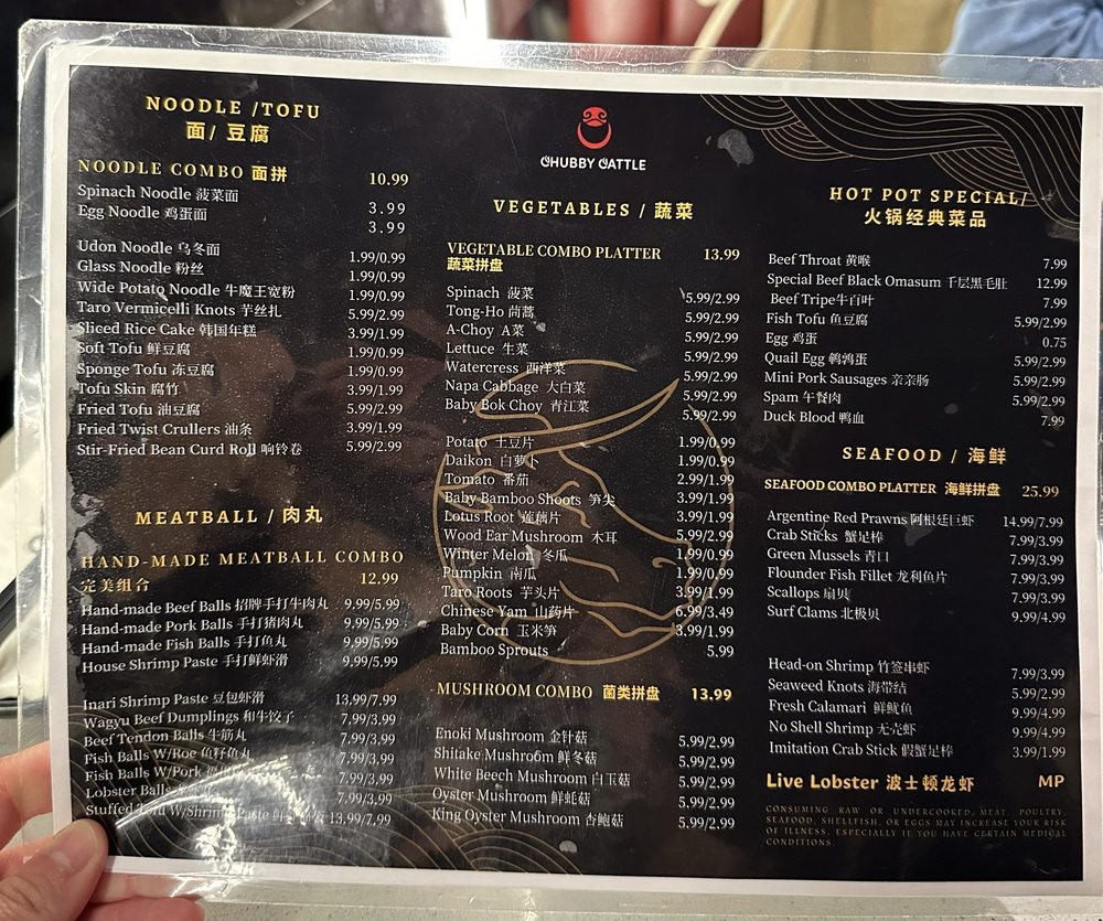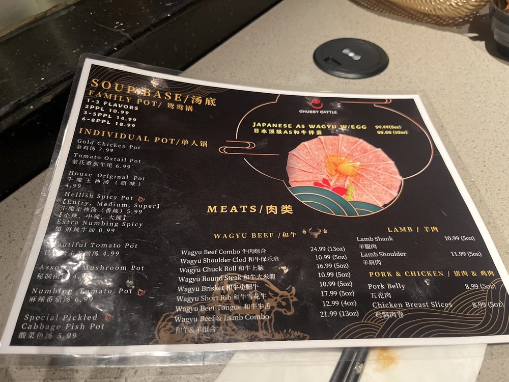 Introducing the menu at Chubby Cattle, a trendy and casual restaurant located in Las Vegas, NV, offering a unique dining experience with their Mongolian hot pot dishes. With a diverse range of options including Pescatarian, vegan, and vegetarian choices, Chubby Cattle caters to various dietary preferences. Customers rave about the generous portions and flavorful broths, such as the tomato oxtail and chicken base pots. The attentive service provided by servers like Sami and Sammy enhances the dining experience, making customers feel welcomed and well taken care of. The quality of the wagyu beef, fresh vegetables, and unique sauces like peanut butter and cilantro elevate the hot pot experience. Overall, Chubby Cattle is a must-visit destination for those seeking a delicious and interactive hot pot dining experience.
